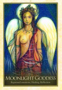 The Moonlight Angel depicted on this card is here to reflect back to you the repressed emotions you have stored inside you. She is here to heal you through your dreams. But in order for this healing to take place, you must pour out your heart and express how you truly feel. Do this for yourself and for others. Remember, all that you repress not only affects you, it also affects those around you, especially those you love the most. It is safe to acknowledge your feelings, it is alright to cry – just surrender and let it all go. You are surrounded by love and the healing energies of the Goddess. You are eternally loved and eternally protected. In the coming month, you will reflect on the past, you will give thanks and let go of old hurts and disappointments. Only the loving memories you will keep inside your heart. Then, once the chambers of your heart are yet again full of light, a new season begins – a new journey, a new joy, a new passion.