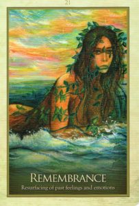 This card signifies that past feelings and emotions are resurfacing from deep within you and you may find yourself on an emotional roller coaster over the coming days. Do not fight it, this is all fine. It is important to occasionally remember and honour your past, for it is part of you, part of your soul’s journey. Yet remember to honour every part of it, regardless of whether you perceive some parts to be good or bad, for in some way every experience has helped to expand your understanding and appreciation of life. Occasionally reflecting on the past is healthy, just as giving some thought to your future is wise. However excessive preoccupation with either only serves to rob you of the present moment and that serves no real purpose.