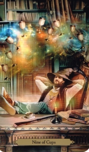 Traditionally, the Nine of Cups was called the wish card. Before a reading started, fortune tellers of old would tell sitters to make a wish. If the Nine of Cups came up anywhere in the reading, it meant that the wish would come true. It is similar to the modern interpretation: you feel like your wishes have been realized and you find the results extremely satisfying.