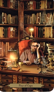 Water grows stagnant if it doesn’t flow. This wizard has been sitting alone in his office too long. The books and tools that were so exciting and inspiring are now gathering dust. His emotions are dull and heavy, unfit to fuel anything healthy. He needs something fresh and new to wash away his ennui. Luckily, there is a shiny new cup glittering for his attention just behind him, if only he could wrest his eyes away from the cups that are boring him silly.
