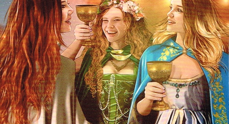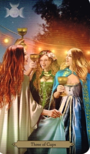 The Three of Cups celebrates emotional and social connections. When people come together in love and friendship, they help each other become the best versions of themselves that they can be. Under the light of the moon, these wizards explore not necessarily who they are but who they might be and how they change in relation to others. Differences draw them together instead of separating them.