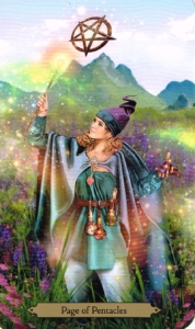 This inquisitive and capable young page is curious about the physical world, loves the connection between the material and spiritual realms, and takes pride in being prepared. She practices with patience and humility. She is usually a collector, either of information or physical items. Because of her connection to the material world, she needs guidance to avoid greediness, hoarding, or materialism. Once she develops a balanced understanding of the connection between the physical and spiritual realms, she will be able to move mountains for the right reasons.
