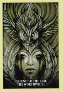 The oracle brings guidance to honor even the smallest steps in your path of the sacred warrior. They are no less important than the more noticeable or dramatic actions on the path. One misstep can begin a landslide of great devastation. Being vigilant with what is meaningful and what is truthful, even in the smallest and seemingly most insignificant ways, strengthens the sacred warrior and prevents darkness from gaining a stronghold from the inside. That darkness will be intelligent and sneaky. It will tell you that it doesn’t matter, that this one time you can forget what you promised, that you are just one person and that you can’t make a difference anyway. That darkness will lure you into sleepy ambivalence and dull your light, if you allow it to. The sacred warrior within will fight with love and honor to be true to what has meaning, and never, ever allow it to be cast aside – even if it seems easier in the moment. The sacred warrior finds joy and humor in life, to prevent the seriousness of the task from stifling the heart that just wants to live and be free, That joy brings strength to the warrior and an expanded, relaxed awareness that can sense the presence of fear (whether it is masked as anger, hate or doubt) and immediately respond to it with fierce compassion. The sacred warrior will not allow fear to gain a stronghold within the heart.