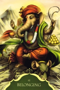 In this card, Ganesha uses the mouse as his vehicle, which signifies his triumph over the ego. In Hindu mythology, the mouse symbolizes the ego, for the ego can eat away at all that is good and decent in a person.