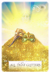 The Oracle’s Message: It’s only human to want to adorn oneself in trinkets and paint a pretty picture of oneself. It’s natural to want to acquire the trappings of status – or to deny them as a statement of rebellion. But is ti sparkles, is it better? Whether it’s a fast car, a big house, a title or position, the stamp of authority, or the sparkling of diamonds, these icons let you know something a bout a person, place, or thing. Or do they? The truth is that people seek to acquire things because of what they will do for them, and how they symbolically will elevate them and make them more attractive. This card signals that it’s time to see beyond the adornments and probe underneath the surface. Learn to recognize the masks people wear and the motives underlying them. Imagine that all the glitter is gone. Would you still desire the object or person?