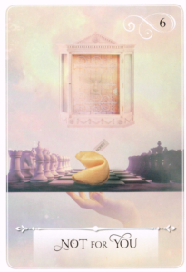 The Oracle’s Message: There are times when it appears that no matter how deeply you desire something, no matter how hard you work at something, the result you seek always seems to elude you. It’s as if you don’t really get to be in the game, and you feel you’re just watching from the sidelines. The appearance of this card indicates that you are not going to attain what you want right now – that, indeed, your dreams for that exact thing will not be fulfilled. This is a time to radically accept that not everything is available to you when you want it. Take heart, for there are benevolent forces who desire the best for you and have a much clearer idea of what is for your highest good. Rejection is God’s protection. Something much better that will make you truly happy is on its way! Trust this.