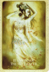 Imagine within this darkness, you sense a light weaving gracefully, endless blossoms of light following in its trail. Allow yourself to join with that light, becoming aware that it si the beautiful Sky Dancer Kuan Yin. If you wish, join her in the dance, feeling the heavenly light of creation flowing all around you both now, as a beautiful, open blue sky streaming with sunlight. Feel the joy as blossoms flow from Kuan Yin’s aura and swirl around you both in spirals.