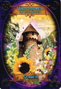 Calling upon the Guardians and Gatekeepers of the South! The season of Summer brings you love as it works in conjunction with the element of Fire. By visiting the Watchtower of the South you are being assisted in awakening your kundalini energy through lust, attraction, and desire. Strength and power fuels the motivating lifeforce energy that ignites your inner flame. The South will accompany you as you walk your path with vitality and vigour. Connect with the Mother aspect of the Triple Goddess and the Father God who brings everything you’ve worked hard for. Your work is done; time to have fun and enjoy the abundance that Summer bestows upon you. The colour red represents the element of Fire and should be used in accordance with your magical workings at the time of noon. Summer breathes renewed passion into your association with the card that flanks this one.
