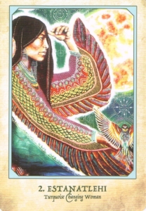If we are struggling with change – either too much of it or perhaps too little of it – Estanatlehi comes to us with reassuring guidance. When something is in need of repair, Great Spirit knows how to restore it. When something needs to end, Great Spirit will show the way to empty ourselves of the past and prepare for a new beginning. When there is lack of deprivation, the abundance and generosity of the Universe shall bring fullness. We do not need to fear change, whether wanted or unwanted. We just need to trust in the good and loving workings of the Universe. Estanatlehi reminds us of the divine feminine wisdom and power which expresses itself as life, always flowing, always changing, always evolving. We belong to life and can trust in it. Evolution is not always easy – often it requires tremendous courage of the heart and inner strength. Yet the Turquoise Moon Mother will help us respond to any change in a way that increases love, light, and wisdom within us and the world.