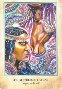 Medicine Horse brings healing gifts for the mind, body and soul. Horse is a healer. This oracle indicates a time of significant healing is at hand. Sometimes the most powerful healing at a soul level happens subtly. It may involve emotional catharsis and dramatic psychological “aha!” moments, but it often happens almost invisibly, without us realizing how much our inner work is reshaping us from within. Eventually, we experience the fruits of our inner journey. Our interpretation of past experience changes, empowering us to leave behind old points of view, former identities and negative expectations for the future. We begin to feel the lightness and promise of our spirit. We discover and take delight in our own divine beauty. We have made progress and a new horizon opens up.