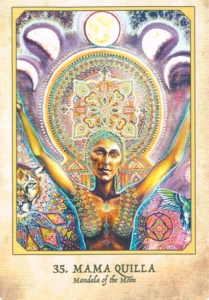 Gaze softly at the mandala depicted in the center of the oracle card image. Gently note the circular outer form and the ornate square configuration in the center. Relax. You are gaining healing from the Divine Mother as you do this. Let your gaze dwell upon the moon in her cycles and the sacred feminine figure in serene and joyful acceptance. Rest.