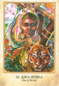 In the Hindu pantheon of divine beings, Durga shines bright as a powerful warrior goddess and protector of the good and true. She is the unified potency of all divine forces of goodness against negativity and evil. An icon for independence and divine power of the light, Durga is the solar mother who shines light, restores order and protects the human soul by destroying impurities such as jealousy, hatred, anger and selfishness. She is creative inventive, responsive and powerful. Once, a particularly adept demon looked like he was getting the upper hand in battle with her, so Durga promptly birthed Kali out of her third eye. Kali, the black goddess, ferociously destroyed the demon immediately. Durga is the invincible One. The Sanskrit word durga means fort, a place that is protected in battle and unable to be overcome. Durga’s power animal is the tiger, indicating her unlimited power to protect virtue and destroy evil. She is bright. She is swift. She is unconquerable goodness.