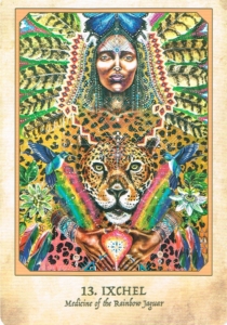 Ixchel’s teachings include her story of falling passionately in love with a man who did not respect her. Eventually, to get away from him, she shape-shifted into a jaguar, becoming invisible whenever he sought her out. In this way, she evaded him and saved herself – and the world which relied upon her bounty and vitality – from destruction. Ixchel teaches us of the need to confront what isn’t working in our lives, including the influence of negative people, honestly, without fear or compromise. Jaguar is not a half-way medicine. If we allow unworthy influences to take up residence in our minds, our heart, our souls – even just a little – they will eventually be our undoing, eroding our happiness, self-esteem, vitality and ability to fulfill our passionate purpose. Ixchel brings Jaguar to remind us that exploitation, abuse and disrespect are unacceptable and must be dealt with effectively, according to correct timing and with absolute certainty in our hearts. This is not about harming another but about cutting off their influence in our souls.