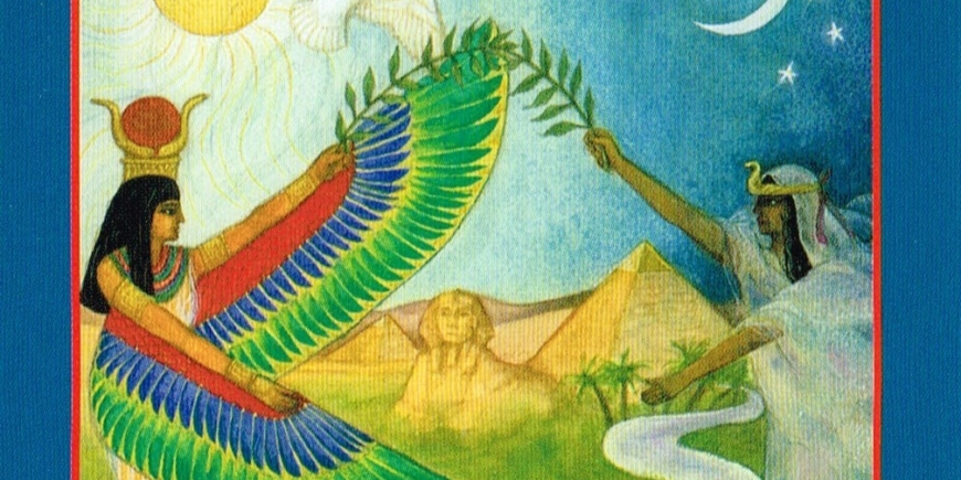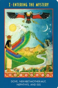 The dove represents the petitioner who is questing through the Anubis Oracle. The innocent, trusting dove flies to meet Nekhbet-Mother-Mut. After offering the olive branch to the elder alchemist, the dove gains permission to enter into the shamanic mysteries of Egypt. Nephthys and Isis form the sacred archway through which the dove must pass to go deeper into the heart of Egypt and her mysteries.