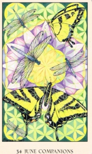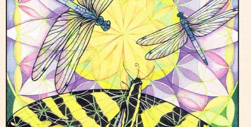 Dragonflies and swallowtail butterflies adorn this card and speak of transformation. The flowered background holds the complex geometric informational system known as the Flower of Life.