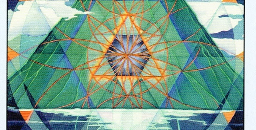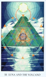 Pictured on this card, geometric seeds of light reflect across quiet waters from the light of the full moon. A triangle of fire accents the pyramidal format of the volcanic cone and speaks to the energetic potential held dormant therein.