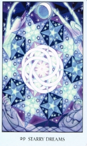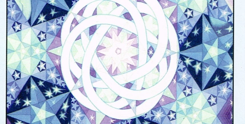 Stars and stars and stars…this card uses the five-sided geometry of the pentagon and its ability to design stars that fracture into infinity. This geometry creates a starry field in which the transcendent power of dreams can be used to access personal stories and visions. In the center of the card we find a knotted torus of light winding itself around and amplifying the effects of your starry dreams.