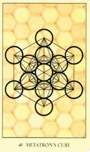 The geometry of this card is the place at which female and male energies join to create something entirely new. By beginning with the thirteen “female” circles from the Fruit of Life and connecting every center with straight “male” lines, a shape known as Metatron’s cube appears. View this image as a three-dimensional configuration. Within the shape, concentrate on the lines and see if you can find each of the five Platonic solids, or cosmic volumes, as we like to call them. You can see, then, how the joining of male and female energies creates substance and form.