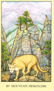 Within this card is embedded the geometry of the pentagon. It speaks of power and excellence, of protection and divine transcendence. The natural world, with its variety of environments, provides a wonderful classroom for exploring your connection to the cosmos. Messages come to us in myriad forms. Be advised to listen to the wind, the water, and all the voices of nature. Connect with the rock people, and listen to what the animals have to say.