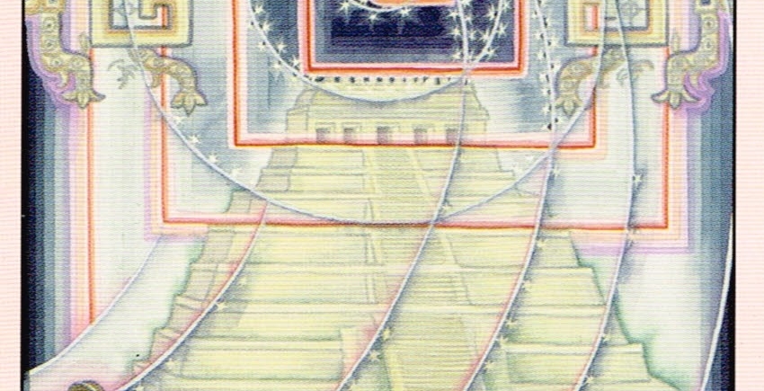 Spirals compose the most basic geometry of life and speak to us on a level of deeper knowing. Spirals both curve and move in an angular fashion. This card contains both curved and angular spirals. The design at the top and sides is painted on a wall in the ruined Mayan city of Palenque, in Chiapas, Mexico. It is symbolic of the beginning, the germination, the essence, and the seed from which all life springs. In the background is the Temple of the Inscriptions. This temple contains the tomb of the Mayan king Pacal the Great, whose sarcophagus has been the subject of much research and conjecture.