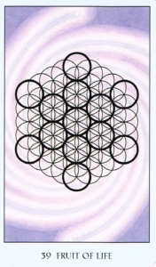 This card takes us a step beyond the Flower of Life. By removing the two circles around the Flower of Life and adding another full rotation, we find a design that holds within it a pattern of thirteen circles known as the Fruit of Life. These changes to the design have unveiled another layer of wisdom. This pattern holds complex informational systems and is considered a female gateway.