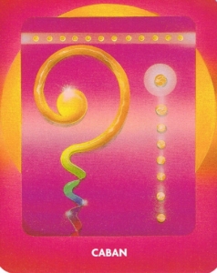 In drawing Caban, you are being offered an awareness of synergy and synchronicity. Watch for subtle new patterns emerging, for they offer your heart’s greatest desires. Remember that seeming coincidences, or synchronicities, are the sparkling points of illumination in the tapestry of magic. Watch for these seeming coincidences and strong feelings as clues to your larger purpose. Learn to observe and digest data and feelings until conclusions emerge naturally. Be alert to natural synergies developing with others of similar intent. Remember, you hold the Earth within you. You are the global family, the keeper of the Earth’s garden.
