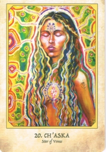 The oracle of Ch’Aska is the oracle of Venus, the morning and evening star. She heralds the transition into a new reality of higher consciousness and healed experience regarding money, financial power and resources. This oracle guides you to give up false shame of not having enough, or guilt for having too much. Your true worth is a matter of soul and has nothing to so with material things. As you relax and acknowledge the love that the Universe has for you, your material reality will unfold with grace and divine support.