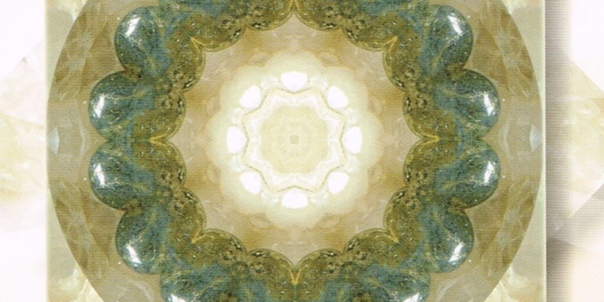 If we gaze upon the Magnetite and Pyrite Oversoul mandala, we will be drawn towards the circle of blue/black ovals with gold flecks running throughout. There is something very calm and orderly about this mandala. Notice a clear eight-pointed star in the middle as well as embedded into it, another eight-pointed star.
