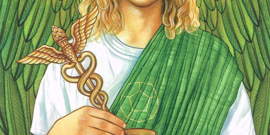 Healing angels can help you heal emotionally, spiritually and physically with their energy, but they can also direct you towards information that will help you return to wholeness. When this card appears, information is being revealed that can help heal an aspect of your current situation, whether that be your health, relationships, or even career, so be alert for this. The Medicine Guardian has a caduceus (healing wand), which represents the capacity to heal with the power of will and desire, and a chalice, which represents returning to a state of wholeness – a state where your cup is no longer full but overflowing with goodness. The emerald color of the card represents the healing rays of Archangel Raphael and his healing angels.