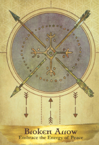 Just as the Arrow card symbolizes defense and protection, the Broken Arrow card symbolizes peace. In Native American traditions, a broken arrow would mean that tribes were no longer fighting one another but were making alliances. When you see a broken arrow in a meditation, vision, dream or reading, it is a message that you no longer need to fight, because peace has arrived. This is a powerful symbol of harmony, serenity and community.