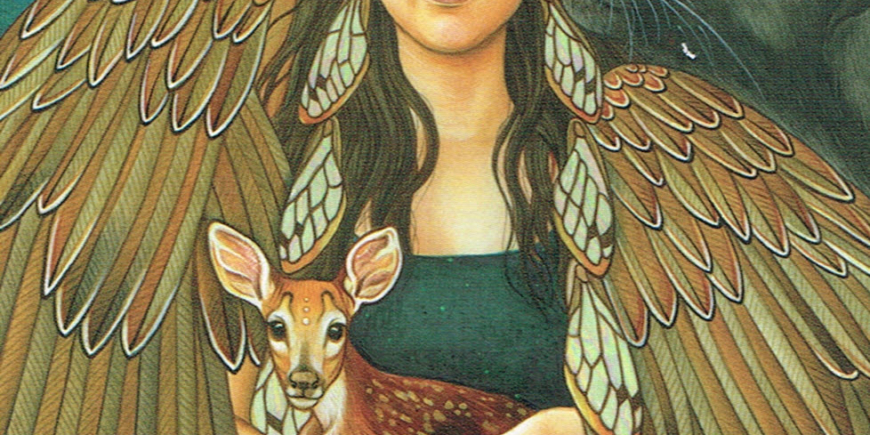 The Animal Guardian card depicts a tribal angel being held and supported by her animals. She has a love for them and they have a love for her, demonstrating how incredibly connected nature is with the spiritual realms.