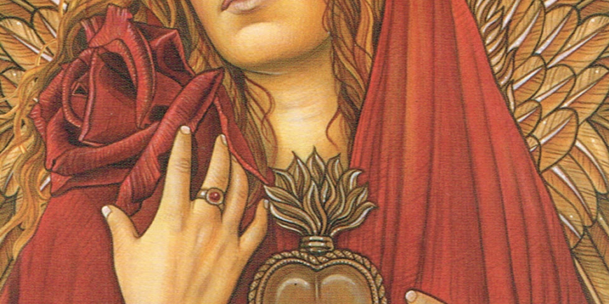 The Heart Guardian is an angelic energy that can help you call for protection and guidance with all issues surrounding the heart. This is essentially the angel who helps you with all relationships, whether they be with yourself, family, or even a romantic connection. She can enable you to move beyond any limiting fears about trust, discern whom to trust and understand how you can move forward in a balanced relationship with that person. In this card, she is adorned with a sacred heart and draped in a red cloak to show her capacity to let love lead the way.