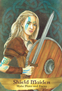 The Shield Maiden is the female Knight in shining armor. In Viking traditions, women were seen as equal to men, and so joined them on their raids and fought with them on the battlefield. In this deck, the Shield Maiden brings a fiercely feminine energy – the power to be a warrior while retaining feminine sensitivity. She is ready to put her plan into action – she’s ready to go into battle. Her medicine helps us move beyond any unsettled feelings when our plans start to take shape and follow through with our strategies in order to be where we want to be. Shield Maidens worked together in times gone by to create shield walls of protection, so she also shows us how to work with others in order to bring our plans to fruition.