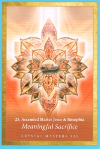 I call upon the Crystal Angel of Rosophia and Ascended Master Jesus Christ who love me unconditionally. Thank you for the divine healing blessing of meaningful sacrifice. May the discipline asked of me be an opportunity for me to discover my inner strength, courage and faith. May I ne supported by love to surrender my attachments to how I wish things would be, so that the Universe may bless me with all that would cause my soul to overflow with joy. May I be protected and nurtured on my true path and divine destiny at all times. All that I unconditionally surrender to divine love attracts even greater blessings into my life. I accept the blessings that become available to me through my meaningful sacrifice. Through divine grace and my own free will, so be it.