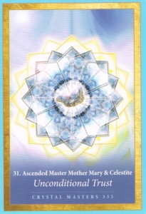 I call upon the Crystal Angel of Celestite and Ascended Master Mother Mary who love me unconditionally. Thank you for the divine healing blessing of unconditional trust. I grant the Divine unrestricted access to my life through unconditional love and divine mercy. My trusting heart loves you and accepts your guidance so we can shine as one, for the greatest good, bringing trust into the hearts of all living beings. I feel so safe, loved, protected, guided, helped and supported by the Universal Mother. She loves me so much! Thank you Ma, thank you! I accept your unconditionally loving help. Through divine grace and my own free will, so be it.