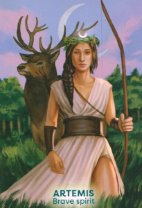 Artemis (pronounced AHR-tuh-mis; Diana to the Romans) is the Greek goddess of the wilderness, nature, childbirth and the moon. The temple built in her name at Ephesus was one of the Seven Wonders of the world. Revered for her courage and untamed energy, Artemis is a protectress of women. She was patron deity of an ancient female warrior race called the Amazons. Artemis and the Amazons are considered the original feminists, as they lived outside the prevailing patriarchy. Artemis represents the independent, wild feminine spirit, beyond patriarchal societal control. With her band of woodland nymphs she roamed freely, immersed in nature, unconstrained by notions of what or who she “should” be.