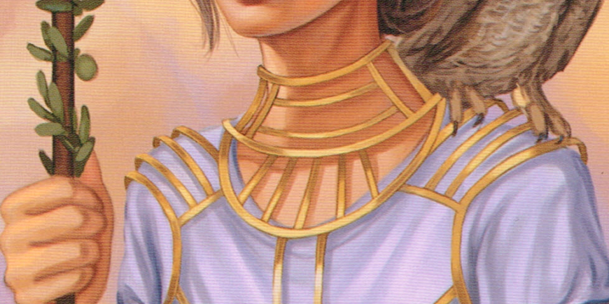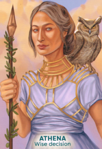 Athena (pronounced ah-THEE-nah; Minerva to the Romans) is the Greek goddess of wisdom, education and independent thought. She carries a Sword of Clarity that can be invoked for intelligent guidance in murky and complex situations. A wartime protectress to the Greeks, Athena offered counsel and strategy rather than engaging in battle. A goddess of practicality, she guides objective thinking and decision making. Her combination of intellect and imagination provides creative solutions and a clear way forwards. Athena’s symbols are snakes, owls and olive trees. Her origins are linked to the Minoan snake goddess of Crete.
