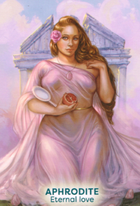 She takes you into her temple, attuning your energy to her rose quartz crystal. Laying pink roses at your feet, her priestesses anoint your body with rose oil. Aphrodite says: