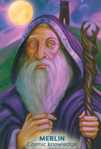 Merlin represents the magician, wizard, sage and wise one archetype, and features in both Arthurian legend and medieval Welsh poetry. His specialty is divine alchemy: the transformation of heavy physical matter energies into higher-vibration energies. Merlin uses the spiritual tools of a purple energy cloak and rainbow chakra wand to bring forward universal knowledge. He’s a Guardian of Avalon, the multi-dimensional realm connected mainly with sacred sites in Glastonbury, England.