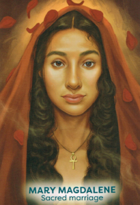 Mary Magdalene was the author of a Gospel and chief apostle to the disciples. She has roots in Gnosticism, where she’s worshipped as an aspect of the Holy Sophia. her ankh pendant signifies her role as priestess of the Egyptian goddess Isis. Mary holds the Shekinah flame (the feminine aspect of God). She presides over the twin flame union: a self-knowledge journey that brings higher consciousness to partnerships.