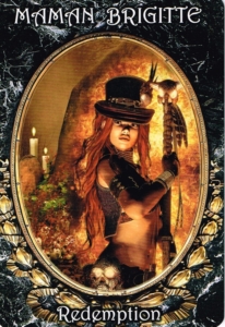 Archetypal “redeemer” of Haitian origin, this goddess of justice is one of the most powerful in the Voodoo belief system. She guards over cemeteries. A figure representing this goddess is the first female buried in every Voodoo cemetery, so that hose laid to rest may, Maman Brigitte willing, be redeemed of their sins or the sins inflicted upon them.