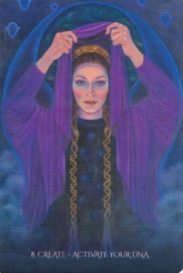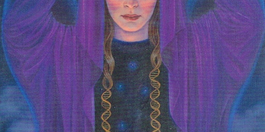 Sophia is often referred to as the goddess of wisdom or the world soul. In Central and Eastern Europe, she is still revered today as the bride of god and the primal force and vehicle of creation. In the Grail Castle of Karlstein, a distinction is made between Sophia and Mary. Sophia is the woman clothed with the sun, the moon under her feet, and twelve stars above her head. Mary is being carried to her by angels. In this painting, Sophia is unveiling herself as creatrix. her hair turns into DNA from which lightning strikes the sea, as scientists suggest may have been the catalyst beginning life on Earth.