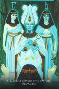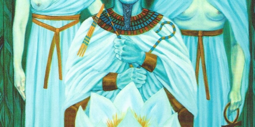 This painting is about the journey through the Halls of Osiris, or underworld initiations. With each lesson learned, the neophyte becomes adept and then, after many trials, attains self-mastery. Osiris sits on his throne in his malachite chamber. His skin is verdant green like the rebirth of life along the Nile. His sisters, the goddesses Isis and Nepthys, stand at his side, while the fully bloomed lotus representing Spirit hovers in the air. Symbolic death and resurrection can occur in the physical world as well. Nearly everyone has experienced the “dark night of the soul,” after which they rise again as a more evolved person.