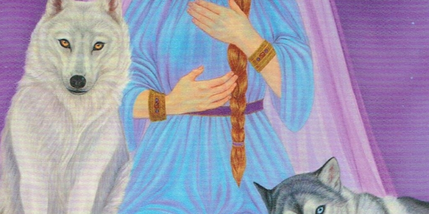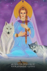 Mountaintops throughout the world have long been a destination of sacred pilgrimage. They are believed to be places conducive for accessing spiritual beings and receiving guidance. This is supported by the fact that there is less oxygen supplied to the brain and the conscious mind at high altitudes, which helps to bring the subconscious mind to the fore. “Shamanka” is a Russian word for a female shaman, which comes from the Altai mountains of Siveria. The figure in the painting also resembles Zorya, the ancient Slavic goddess of sky and light most honored in Russia. Zorya guards a dog who tries to eat the constellation Ursa Minor, the Little Bear.