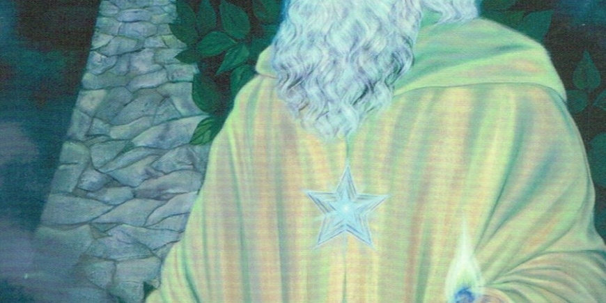 Celestial youth, ancient one: The radiant prophet Merlin stands in the spot where the male and female energy lines cross in the Chalice Well gardens – the point of spiritual androgyny. A “merlin” was a bard and teacher of the Druid mysteries. The historical Merlin was called Myrddin Emrys (Merlin Ambosius). His castle is a hillock of crystal stones in Gwynedd, North Wales. The breathtaking view from the top is the enchanted landscape of Snowdonia, with the river Llyn Dinas winding it way through the verdant valley below. This was formerly Vortigern’s stronghold, but afer his defeat, it was given to Merlin and renamed Dinas Emrys (Fortress of Ambrosius).
