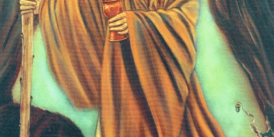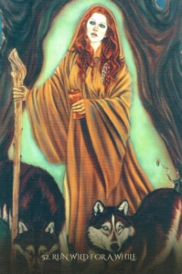 The fae wolf child is emerging from the safety of her chosen seclusion in the strength of the old oak tree, which is reminiscent of Gog and Magog in Avalon. She is carrying her Grail cup, which must be filled. Will she find the special gifts she needs from her experiences and adventures in the wider world? and more importantly, will she learn to create from them, cherishing everyone as a seed of wisdom and inspiration? One green acorn hangs on the branch of the oak. It contains all that is necessary to begin again. This is a positive symbol to return to, silently reminding us that no matter what happens in life, we can always start over.