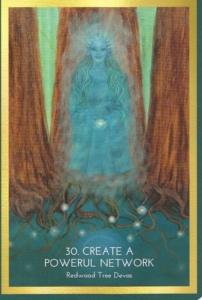 redwood trees grow in family circles, like fairy rings. The trees shallow roots spread out, so they entangle and fuse, creating a sturdy base for their entire community. The roots are a field for communication – redwoods share some of the oldest memories on the planet – and also provide stability for their incredible height. Devas, meaning shining ones, are nature spirits aloigned with and working with the auric field of a particular tree. This deva is a personification of the redwood tree’s mystical soul. Redwoods are record keepers. They can live for more than 2,000 years and are the tallest trees in the world. Empower your shared network. You can grow and achieve great things together!