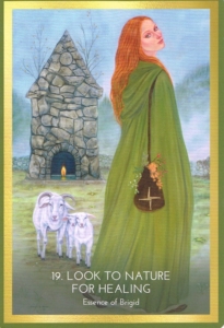 Brigid means “exalted one.” She was thought to be the daughter of the Daghda, the supernatural chieftain of the Tuatha de Danann. This group of highly evolved humans is said to have come in a ship out of the sky. They lived with terrestrial humans for a time, imparting their knowledge of poetry and music, as well as healing plants, fire craft, and other survival skills. Eventually, the Tuatha de Danann retreated to the inner earth and came to be regarded as gods. As a mother Goddess, Brigid protected newborn lambs in spring, and her eternal flame was kept burning. She carries Irish moss and other medicinal winter herbs in her bag. Find what you need to keep the sacred flame burning within you, and it will feed your soul.