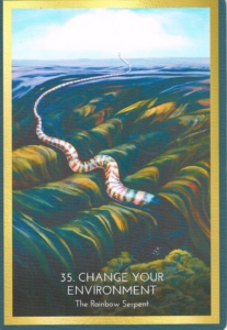 The Rainbow Serpent is believed to be the creator who came to earth and gouged out the hills and valleys of Australia. Age-old stories of the Rainbow Serpent are depicted in the music and art of indigenous Australians. The serpent connects the sacred waters of life from one waterhole to another. Like the Celtic Otherworld, the Dreamtime is a place of no time where the past, present, and future all exist at once. If you take a spirit journey, outside time and space, you may bring back knowledge and insight. You can influence your community and change your landscape wit your new thoughts and creations.