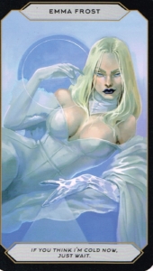 An icy chill is cast over your spread when Emma Frost appears. The White Queen warns of ulterior motives and deception – perhaps what you’re seeing is too good to be true. Her appearance urges you to take a closer look at what is being presented to you. Gather your defenses, examine the offer, and go slowly with the new relationship, until you’re sure it can be trusted.